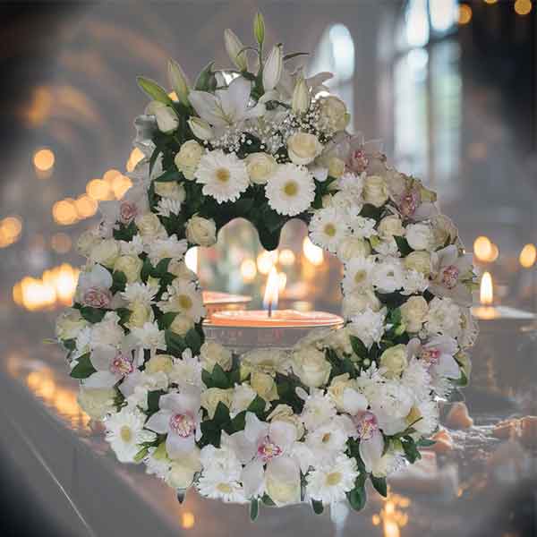 Coroana funerara rotunda alba cu trandafiri crizanteme crini si orhidee
