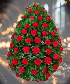 Această coroană funerară rotundă, încrustată cu trandafiri roz, emană o eleganță delicată și respect solemn. Fiecare trandafir roz, cu petalele sale blânde, aduce o notă de căldură și compasiune, sugerând o amintire încărcată de tandrețe. Forma circulară a coroanei simbolizează unitatea și ciclul continuu al vieții, oferind un omagiu atemporal celui plecat.