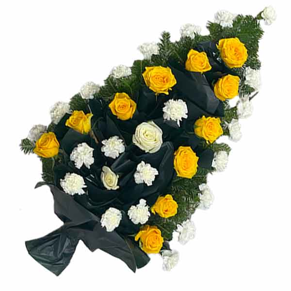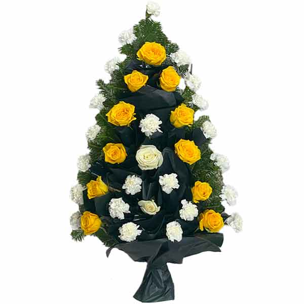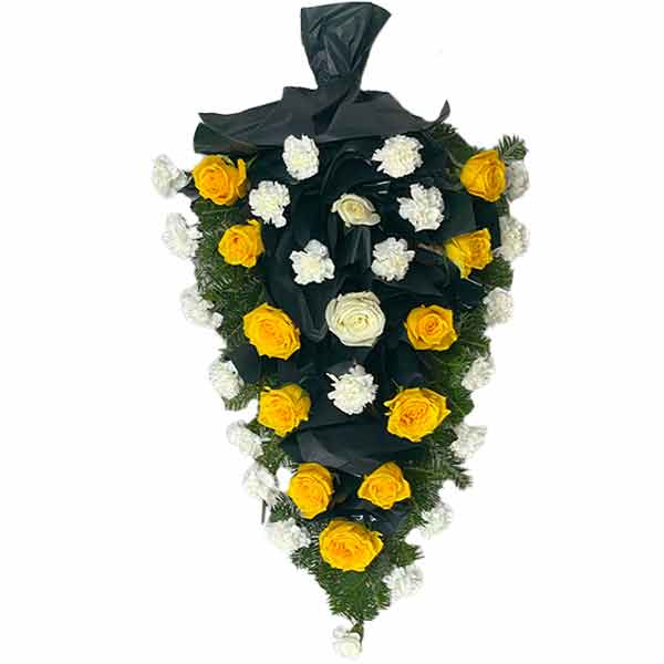 Jerba funerară cu trandafiri galbeni și crizanteme albe