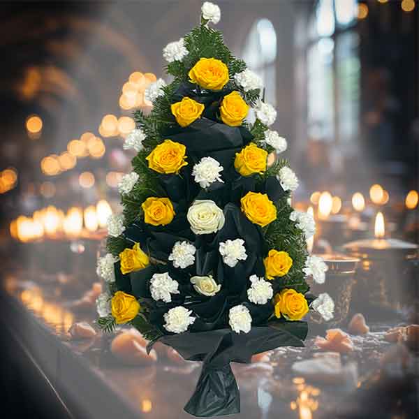 Jerba funerară cu trandafiri galbeni și crizanteme albe este un omagiu profund și luminos adus celui care a părăsit această lume. Cele 30-35 de flori ale acestei jerbe au fost alese cu grijă pentru a forma o compoziție armonioasă și impresionantă. Trandafirii galbeni simbolizează prietenia, bucuria și recunoașterea, aducând o notă de lumină și speranță în momentele de tristețe. Crizantemele albe exprimă respectul și puritatea, sugerând că amintirea celor dragi va rămâne întotdeauna vie în inimile noastre.